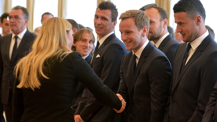 "Vjerujem da ćete se voditi tim mislima i da ćete dokazati koliko u Hrvatskoj ima talenta, snage i želje za pobjedom, koliko ima upornosti i kako možemo biti sjajni te ostvarivati najbolje rezultate kada radimo i dišemo za zajedničke ciljeve. Znam da vam neće biti lako, ali svi vjerujemo u vas i veselim se svakoj utakmici. Molim vas da ne osjećate pritisak, nego igrajte sa srcem kao i uvijek i znajte da ste kao najbolji nogometaši upravo vi ponajveći veleposlanici Hrvatske", istaknula je predsjednica.
