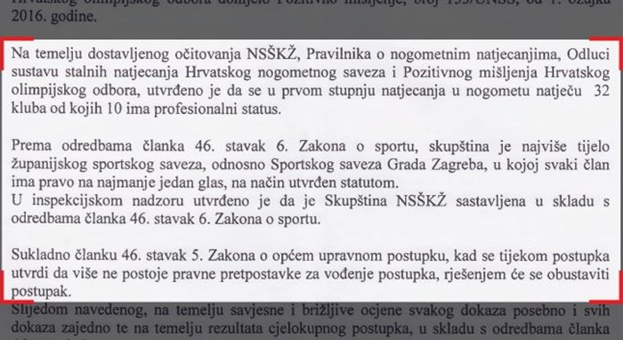 Iz navedenog se može zaključiti jedino to da Hrvatski nogometni savez primjenjuje Zakon o sportu, uključujući i njegove izmjene i dopune, točno onako kakav je usvojen u Hrvatskom saboru. Znači, HNS Zakon ne tumači nego ga primjenjuje. Do istog zaključka je došla i Sportska inspekcija u Šibensko-kninskoj županiji koja je rješenjem obustavila postupak inspekcijskog nadzora nad Nogometnim savezom Šibensko-kninske županije (NSŠKŽ). Obrazloženje je sljedeće: