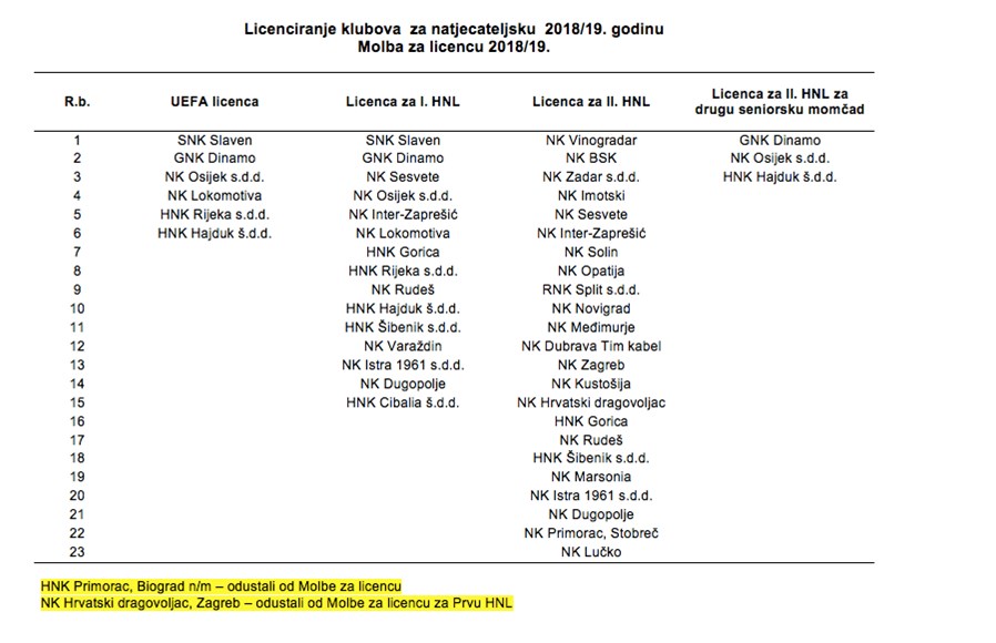 U nastavku se daje pregled klubova koji su podnijeli molbe za UEFA Licencu, Licencu za I. i/ili II. HNL za natj. 2018/19. godinu: