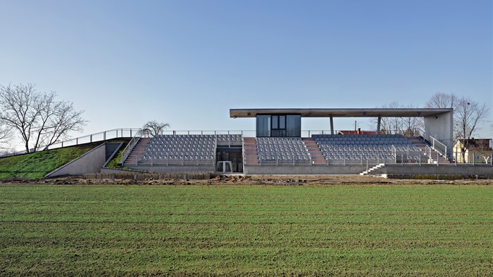 "Na oblikovanje građevine najviše je utjecao ruralni seoski kontekst i lokacija građevine smještena u jednom zelenom ambijentu, gotovo parkovnog karaktera kojeg karakterizira drvored visokih lipa zasađenih uz rub čestice paralaelno s linijama nogometnog igrališta koji stvara prirodnu kulisu gledajući iz smjera stadiona prema terenu. Oblikovanje stadiona karakterizira izdizanje građevine iz smjera juga stvarajući dojam izrastanja iz terena, svojevrsnu simbiozu arhitekture i zelenog konteksta. Izrastanje iz terena manifestira se i u doslovnom podizanju zelenila na kuću u vidu zelenog krova. Primijenjena je tipologija 'stadiona na nasipu' što također simbolički podsjeća na događaj pucanja nasipa i posljedičnu poplavu".