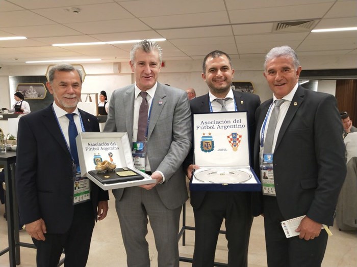 Vatreni su u četvrtak u Nižnjem Novgorodu pobijedili aktualnog svjetskog doprvaka, Argentinu, rezultatom 3:0, a predsjednik Hrvatskog nogometnog saveza Davor Šuker tom se prigodom susreo sa svojim argentinskim kolegom. Claudio Tapia i Davor Šuker razmijenili su prigodne darove i razgovarali o susretu te se zajednički fotografirali.