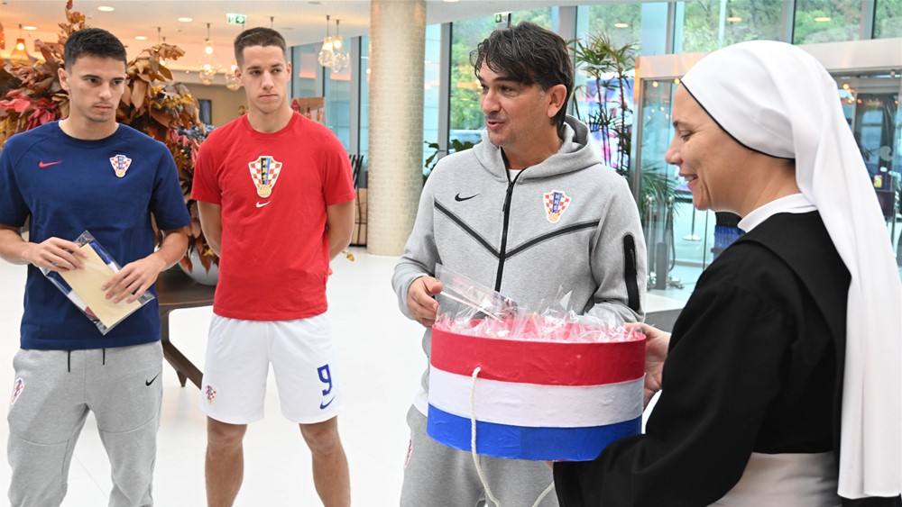 Vrijedne majke poginulih branitelja, koje već izvjesno vrijeme izrađuju suvenire i rukotvorine čijom prodajom pomažu radu Caritasa, izborniku i reprezentativcima darovale su kape u bojama hrvatske trobojnice koje su izradile uz pomoć Caritasovih volontera.