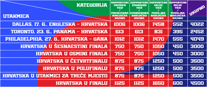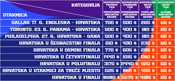 Sukladno takvim Fifinim pravilima, HNS će prijavu za kupnju ovih ulaznica omogućiti navijačima članovima Programa vjernosti HNS-a koji su to pravo zaslužili redovitim dolascima na utakmice hrvatske reprezentacije. Konkretno, pravo na kupnju po dvije ulaznice za svaku utakmicu dobit će prvih 530 navijača na ljestvici Programa vjernosti odnosno navijači koji imaju barem 13 dolazaka na utakmice hrvatske reprezentacije u posljednjih pet godina, a ulaznice iz ove nove, najpovoljnije kategorije kupit će oni među njima koji prvi odaberu ove ulaznice kada prodaja počne, sukladno niže istaknutim kapacitetima.